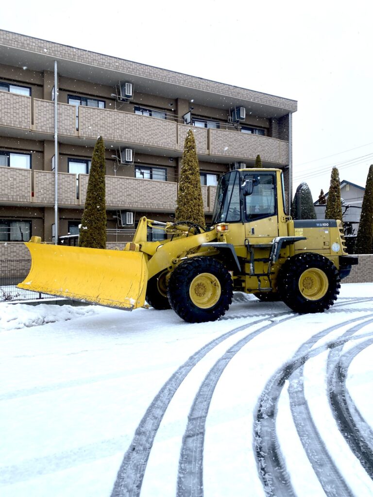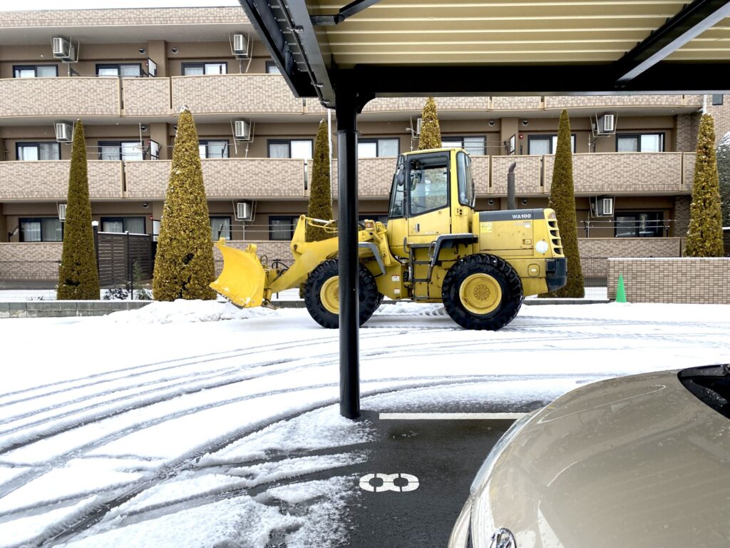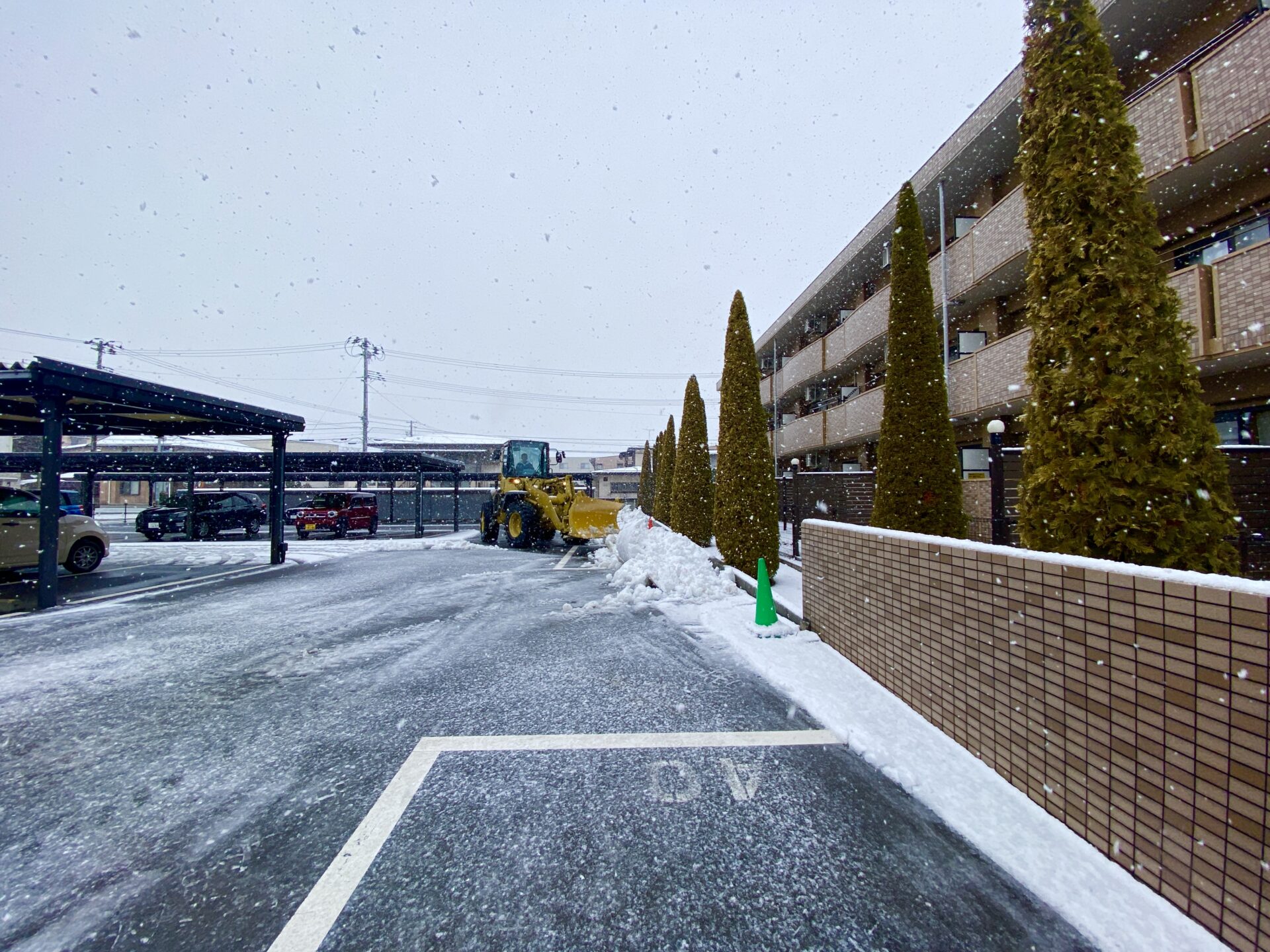 メイブラッサムの屋根付き駐車場では、 雪の季節は除雪車で、車通りを確保しています。